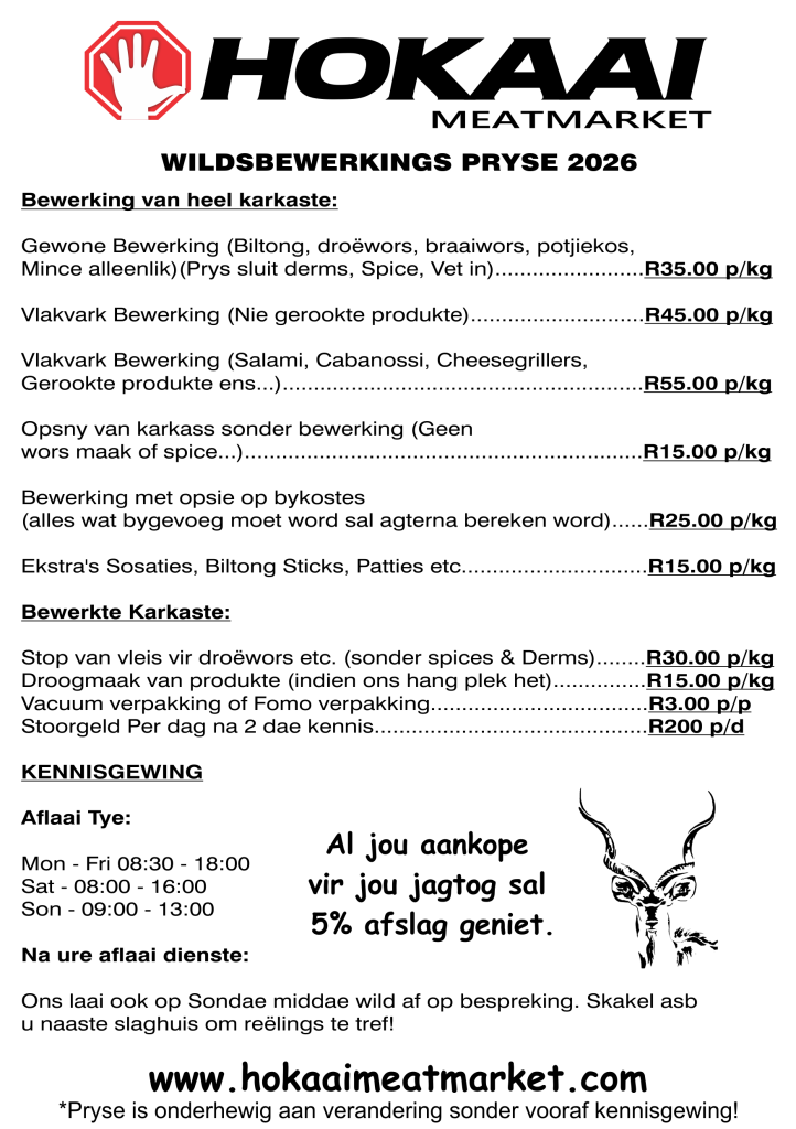 We process your game meat to your specifications, but we do not assume any liability for any negligence on your part. Once your game is ready, we will promptly notify you. Please arrange to collect your processed game meat within 2 days; otherwise, a storage fee of R200 will be added to your bill. We appreciate your understanding that game processing is a time-consuming process, and we operate on a first-come, first-serve basis. Your return in processed game meat will be equal to the weight of game you bring in (e.g., 100kg of game in = 100kg of processed game meat out from Hokaai).